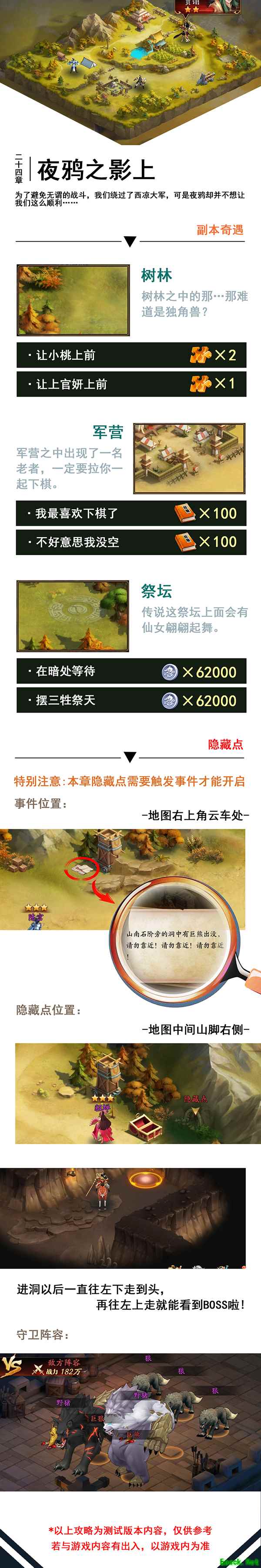 《放开那三国3》24章隐藏点彩蛋位置24章夜鸦之影上隐藏点需要触发事件才能开启 事件位置:地图右上角云车处 隐藏点位置:地图中间山脚右侧