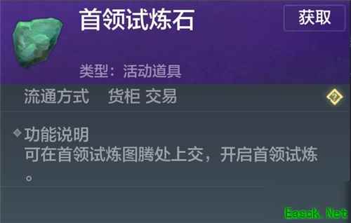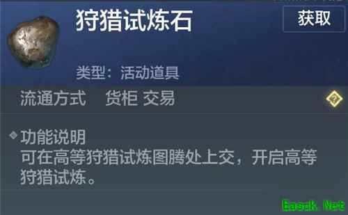 寻找【高等狩猎试炼图腾】,上交后开启【高等狩猎试炼】,图腾样式如下图所示,奖励比普攻狩猎好。 3、首领试炼石