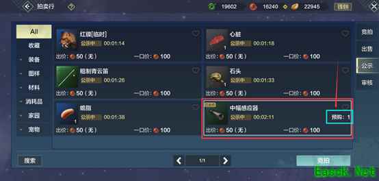 如果实在找不到想要的物品,可以去公示栏中看看,每个新物品上架,都会有5分钟的公示期,防止物品错挂或者被秒。公示期内玩家可以通过一口价进行预购,最多有30个玩家可对同一商品进行预购,公示期结束后在参与预购的玩家中随机抽取一个玩家成交。