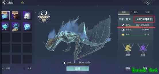 上图左边骨龙等级,左边是宠物当前等级,右边是宠物最高等级,也就是宠物灵气获取上限。目前还没有办法可以突破。 灵气是当前等级的灵气,当达到最高值时,宠物会升级。 宠物等级作用: 宠物等级不仅会加宠物实力,还会增加宠物属性。让宠物变得更加强壮。