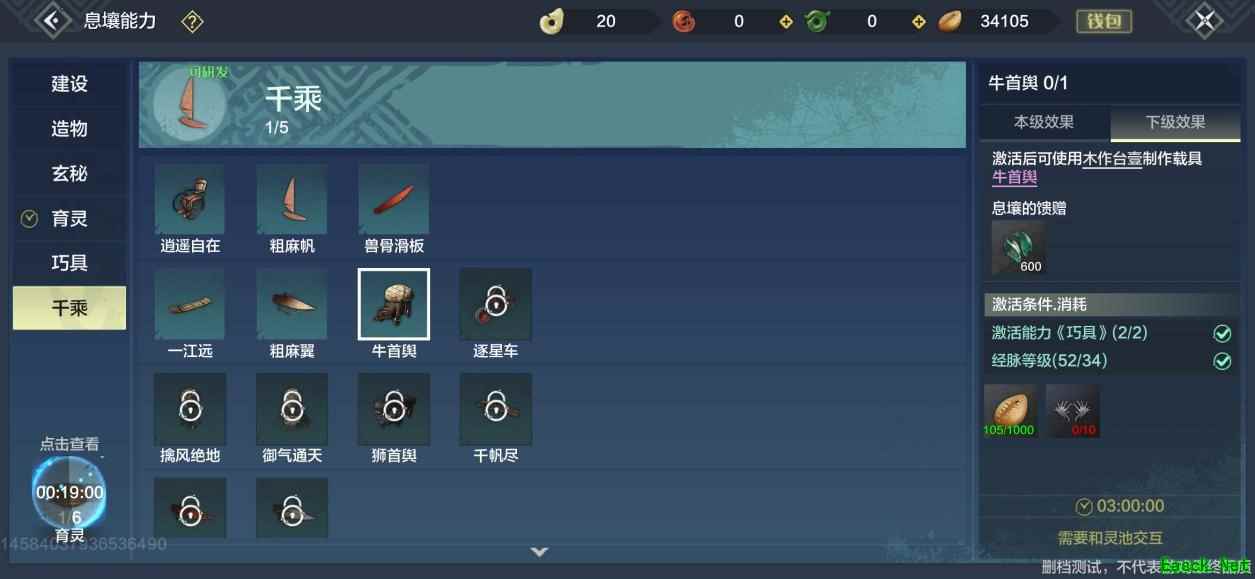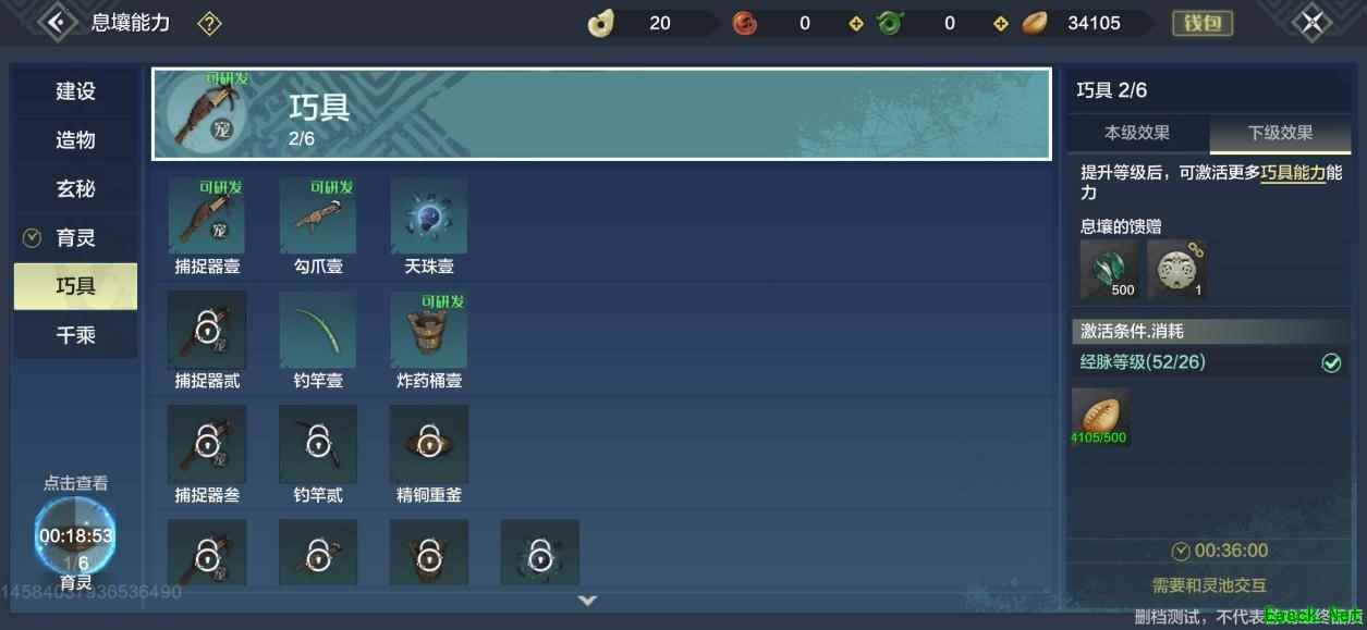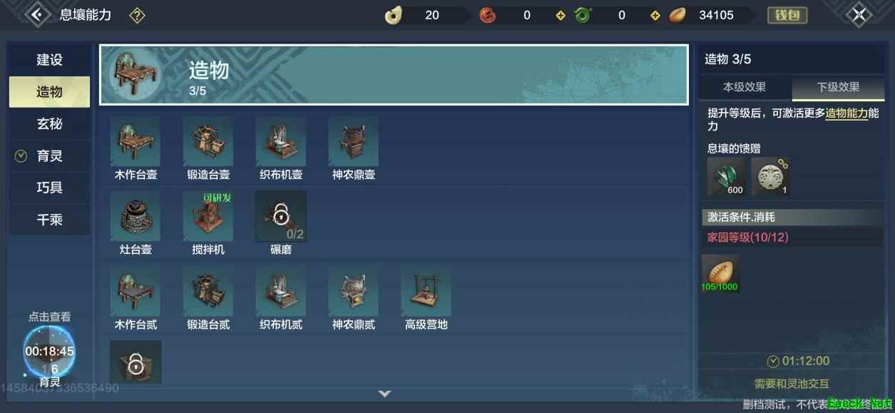 面前有六大分支,分别为建设、造物、玄秘、育灵、巧具、千乘。 每条分支对应一条玩法,可谓是极大的丰富了生活玩家的可玩性。 二、息壤能力介绍 这个分支主要是用于强化家园,美化家园,例如墙纸,火炮等。但是一些功能性道具也涵盖在内,比如游戏机,围猎图、乾坤仪都是前期必不可少的重要道具,所以这条分支优先研发。
