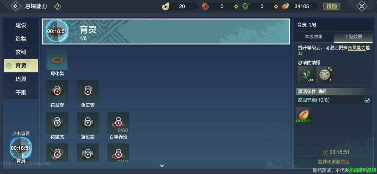 育灵: 育灵主要是孵化元胎,培育花草,养殖鱼苗 的功能。除了孵化巢之外,其他可以等到游戏中期再解锁。