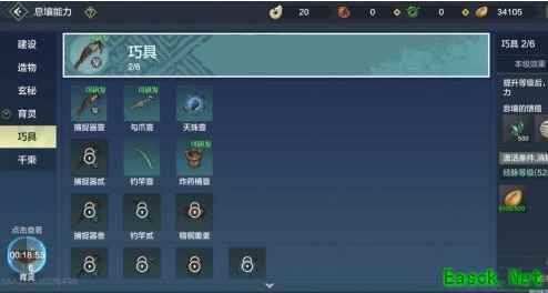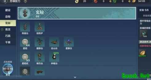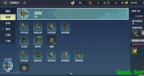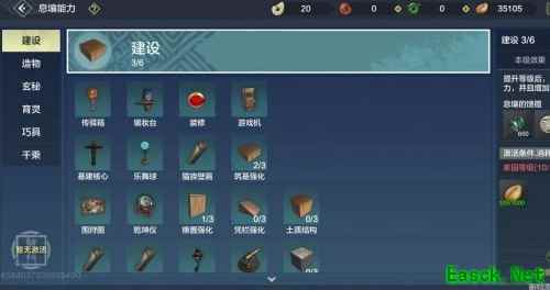 面前有六大分支,分别为建设、造物、玄秘、育灵、巧具、千乘。 每条分支对应一条玩法,可谓是极大的丰富了生活玩家的可玩性。 二、息壤能力介绍 建设: 这个分支主要是用于强化家园,美化家园,例如墙纸,火炮等。但是一些功能性道具也涵盖在内,比如游戏机,围猎图、乾坤仪都是前期必不可少的重要道具,所以这条分支优先研发。