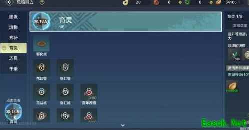 育灵: 育灵主要是孵化元胎,培育花草,养殖鱼苗 的功能。除了孵化巢之外,其他可以等到游戏中期再解锁。