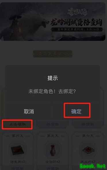 2.点击领取道具(就会提示绑定角色,点确定就好啦!)