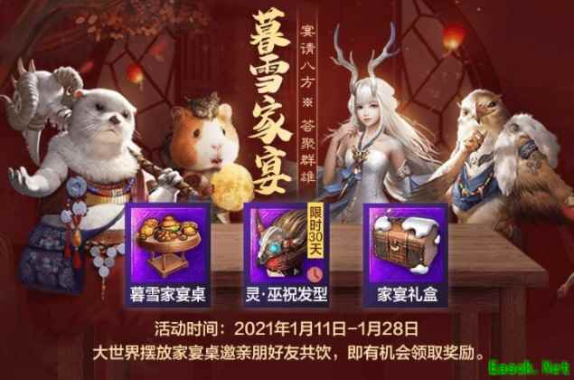 一、活动时间 1月11日-1月28日 二、活动介绍 1月11日-1月28日,游戏官方将开放暮雪节活动。 本次暮雪节将陆续开放“暮雪家宴”“雪怪挑战”“迎冬礼盒”“暮雪祈愿”“暮雪商城”等活动。 时维暮雪,共贺庆典!旅者们届时记得参加活动,领取各类好礼~