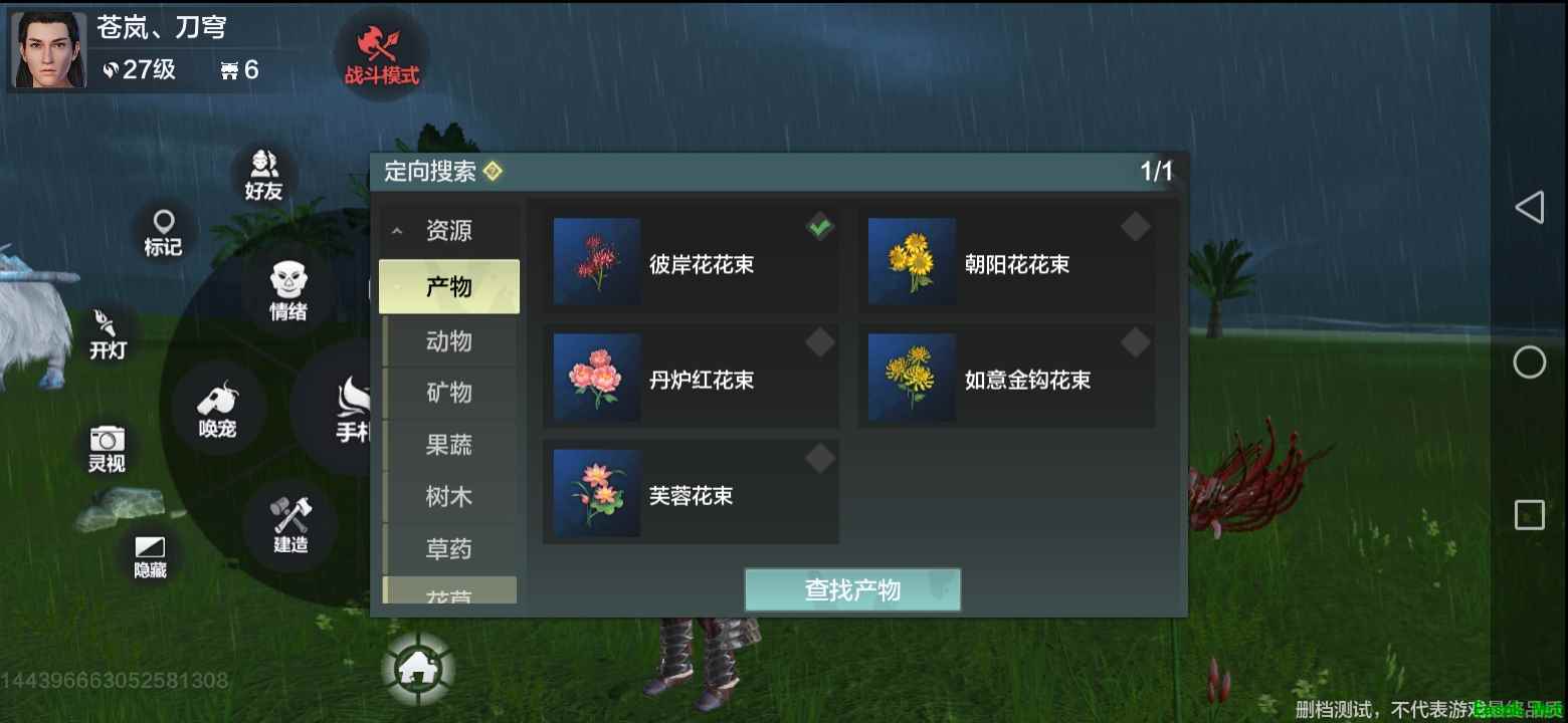 芙蓉花获取方法: 1、在游戏左下角小房子里点击搜索,再点击定向搜索,在里面选择芙蓉花然后点查找,系统回自带定位。 2、打死小动物也有几率掉花,就是地上跑的小动物。