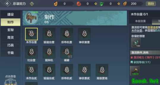 激活成功后,在灵池的造物功能中选择制作木作台一,制作木作台一需要10个木头和10个纤维资源,木头可以在伐木中获得,纤维可以在采集果蔬中获得,使用搜索功能能快速给资源定位,资源收集完成后就可以制作并在地板上放置木作台一了。 第三,制作粗木斗柜