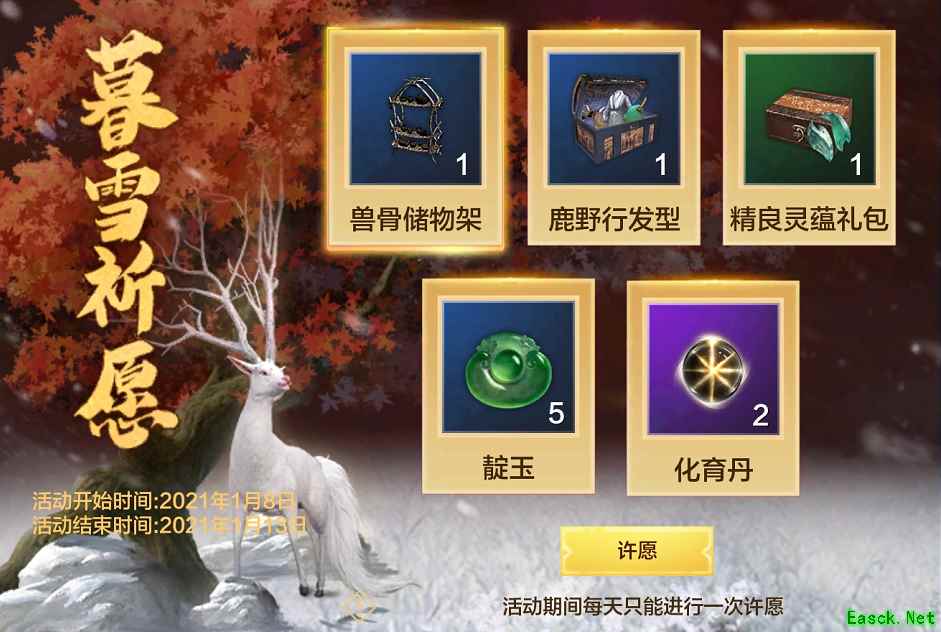 《妄想山海》暮雪祈愿活动介绍一、开启时间 2021年1月8日—1月13日、2021年1月15日—1月20日 二、活动介绍 山海管理司将在以上两个时间段分别开启暮雪祈愿活动,旅者们可以许下心愿,听说夫诸听到大家的心愿后会帮大家实现哦~ 首轮许愿时间: 1月8日——1月12日4:59(每日可许愿一次,每日凌晨5:00刷新许愿次数) 首轮领取时间: 1月12日5:00——1月13日4:59