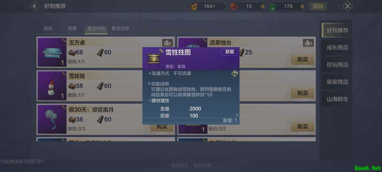 然后在商场里边,每天可以花费十个暮雪礼盒换取两张雪狌狌围猎图,放在你的家园里,然后叫上你的小伙伴一起挑战它,你就可以获得十个暮雪铃铛。