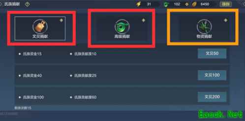 第二步:捐献分为文贝捐献,高级捐献和物资捐献,冰晶和火晶石就属于物资捐献。点进去后,选中对应的石头捐献出去即可使用。