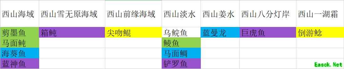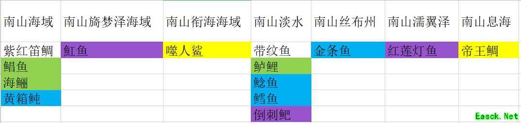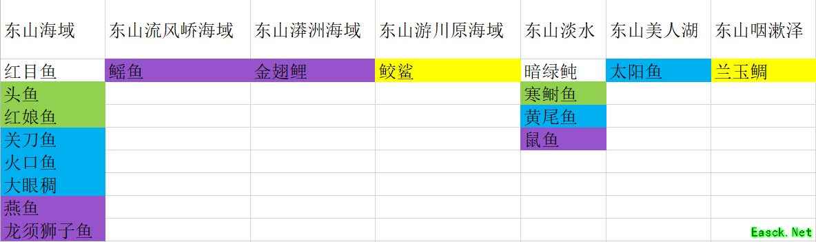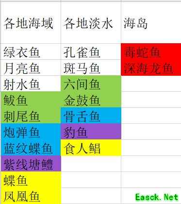 钓鱼分布图一览鱼分为淡水鱼和海鱼,颜色代表稀有度,红>黄>紫>蓝>绿>白。图一是通用产出,就是无论在哪处淡水湖还是海域钓鱼,这些都在产出列表,后面几张是各大陆的产出,各大陆有自己的通用产出,同时特殊地点有特殊鱼,比如我在东山流风峤海域钓鱼,能钓上来的鱼就是就是各地海域+东山海域+东山流风峤海域的所有鱼。 如果大家想快速完成山海经,获得成就属性点,建议大家参照此图,愉快的钓鱼,最后祝大家永不空军!