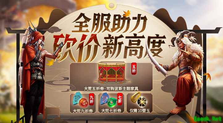 二、助力值礼盒 大荒九折券礼盒(全服助力值达500解锁): 开启后可获得保底1张九折券,还有机会暴击出N张九折券。九折券可用于在商城九折购买勾玉。 大荒七折券礼盒(全服助力值达1000解锁): 开启后可获得保底1张七折券,还有机会暴击出N张七折券。七折券可用于在商城七折购买脂玉。 大荒五折券礼盒(全服助力值达3000解锁): 开启后可获得保底1张五折券,还有机会暴击出N张五折券。五折券可用于在商城五折购买波斯主题家具。