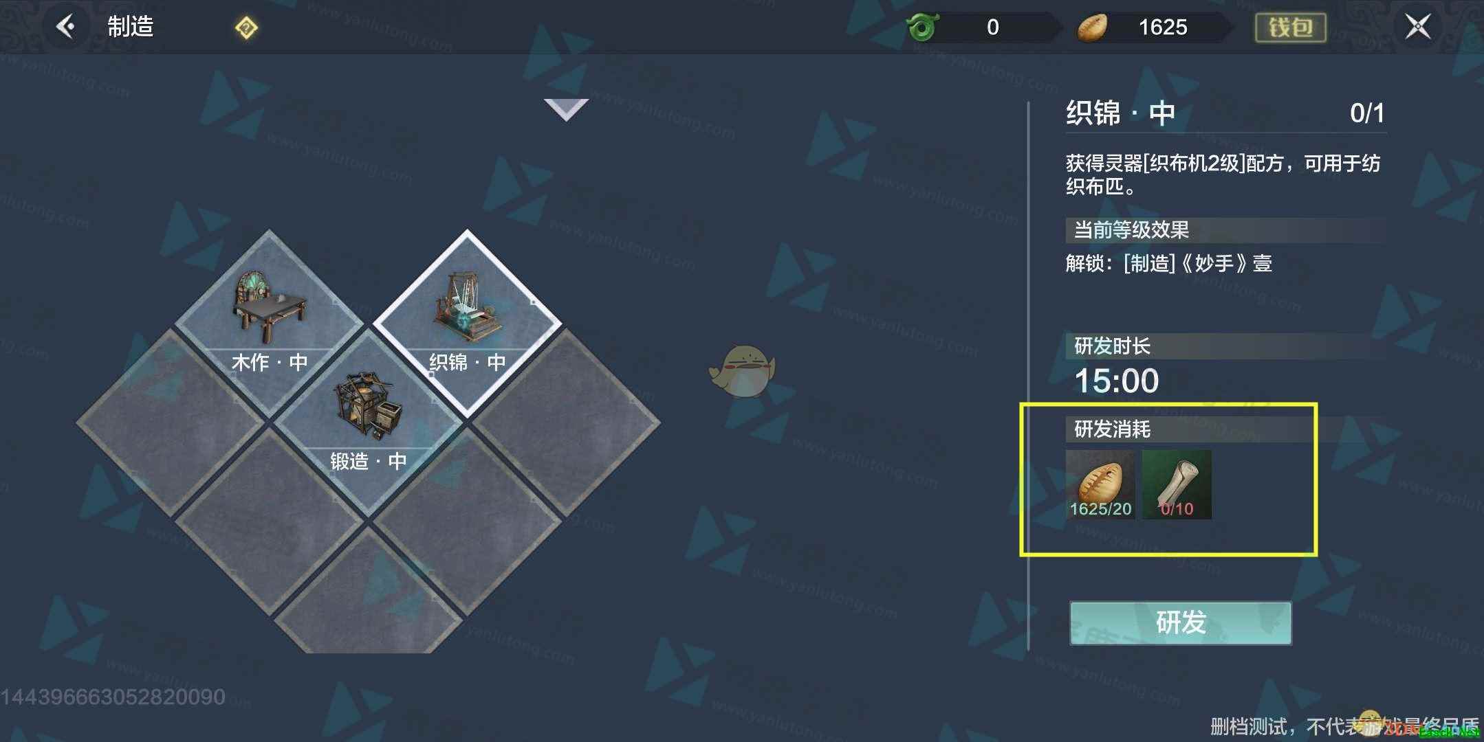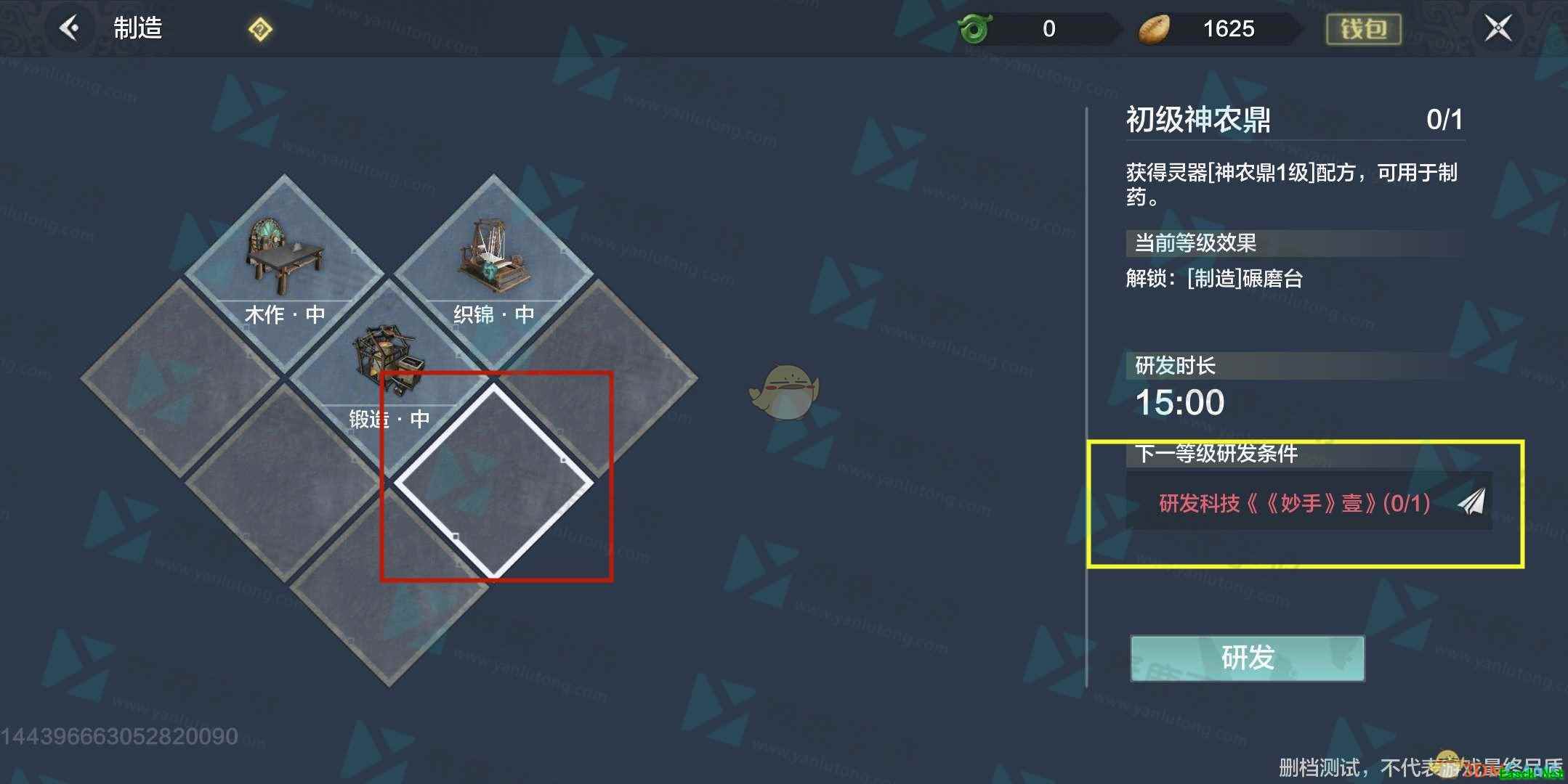 4、我们可以看到制作神龙鼎需要玩家相应的前置任务:研发科技《妙手壹》