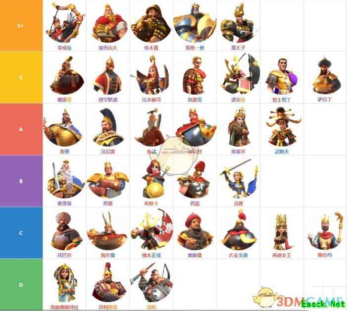评级是根据统帅的总体实战使用程度,主要按照【技能组】、【搭配性】、【使用广泛性】去制定,评级只作参考。 S+为评级最高、D为最低。名字有对应的定位颜色,分别为:『集』集结城市或据点、『战』野战、『守』守城、『野』打野。同一评级没有先后之分。