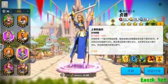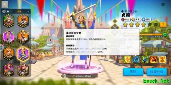 这是贞德作为辅助的一个非常强力的技能,它可以让自己和友军获得一个非常高的buff。我们将buff的收益直接换算成科技的提升,让大家更加直观感受下这个buff的强大之处! PS:这里考虑到前期和后期相同提升带来的战力提升差距过大,所以选取折中计算,以小三围计算 满级小三围带来的攻击力,防御力和生命值分别是15%,但是小三围带来的战力提升为555万。如果你是单一兵种的话,以此来计算,相当于给你的部队带来了370万的战力提升,并且这是一个范围型的技能,可以为你的队友带来同样的增益效果,加起来十分之恐怖。 奥尔良的少女 部队采集速度提升25%,部队负载提升25%