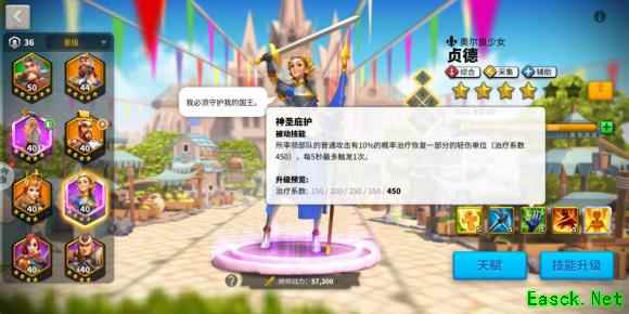 这个技能决定了贞德的万用型,搭配采集天赋使得贞德非常适合采集。 神圣庇护 所率领部队的普通攻击有10%的概率治疗恢复一部分的轻伤单位(治疗系数450),每5秒最多触发一次。