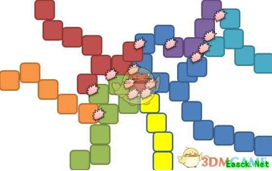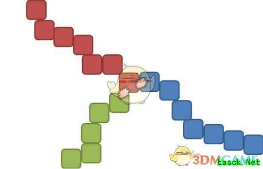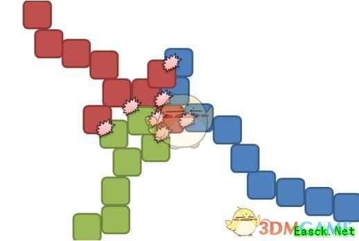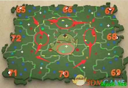 一般情况下,KVK会在这个时期决定出胜者,除非双方都是韧性很强的王国,才会在其他地方展开第三次的战役,否则胜者会将败者们打回关4以内并断绝他们向外发展的道路,而败者们就只能一直种田,直到KVK结束,很惨很惨…… 因此接下来就到R3R2R1选择他们的游戏模式了,正如之前我发过的选择做哪类玩家的文章里有写过,那张图就是KVK里每场局部战斗的缩影。因为KVK的传送有了极大的限制,只能飞到王国领土上,也就导致了战斗模式和内战有非常大的区别。 首先,每一场战役的展开基本大同小异,都是这样的:(假设蓝绿是同一国,红是另一国,单挑时则只有红蓝两方)
