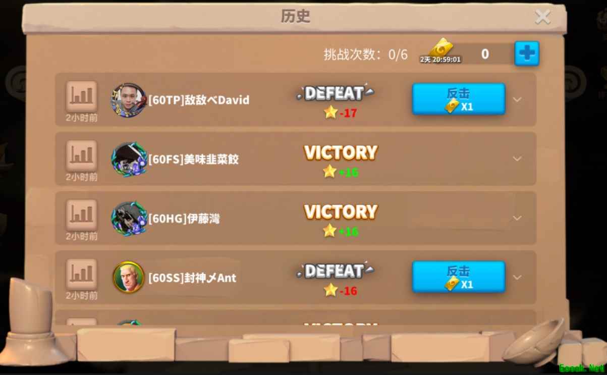 最后再分享一个偷鸡的小技巧,可以帮助你稳定上分,这个小技巧适合在单纯刷战胜奖励,和需要在赛季结束前偷偷冲分拿一下赛季奖励的玩家。 首先在挑战中疯狂刷新,找到一个将领水平很低,你能稳定吊打的玩家(或者你的小号)然后故意输给他一局,这样在右边的历史这一栏里面就会有一个失败的记录,接下来只需要疯狂的点击反击就能稳定把把胜利吃到16分的上分。