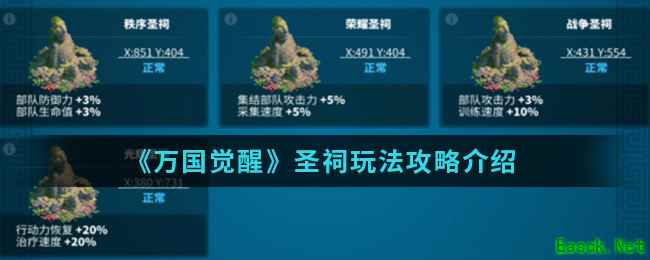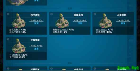 圣祠玩法攻略介绍: 由于受前置纪念碑任务的影响,准确时间各个王国可能不同。圣祠总共有四种,分别为:秩序圣祠,荣耀圣祠,战争圣祠和光辉圣祠。具体的增益效果见下图所示,每种类型的圣祠效果是不能叠加的。