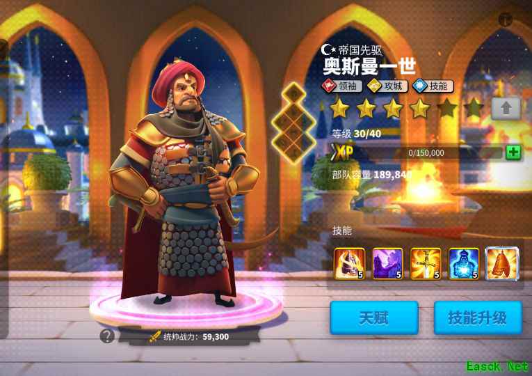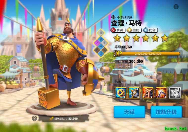 (被)『兵家至圣』 – 所率部队受到伤害减免10%, 步兵生命+10% 这个技能加上二技能所率部队就能减免17%的所有伤害,这效果是非常好的,在加上驻防天赋,所以孙武算是一个很不错的守将。然后步兵生命也+10%,对于步兵来说生命是比攻击和防御更重要的属性,能提供不错的坦度。