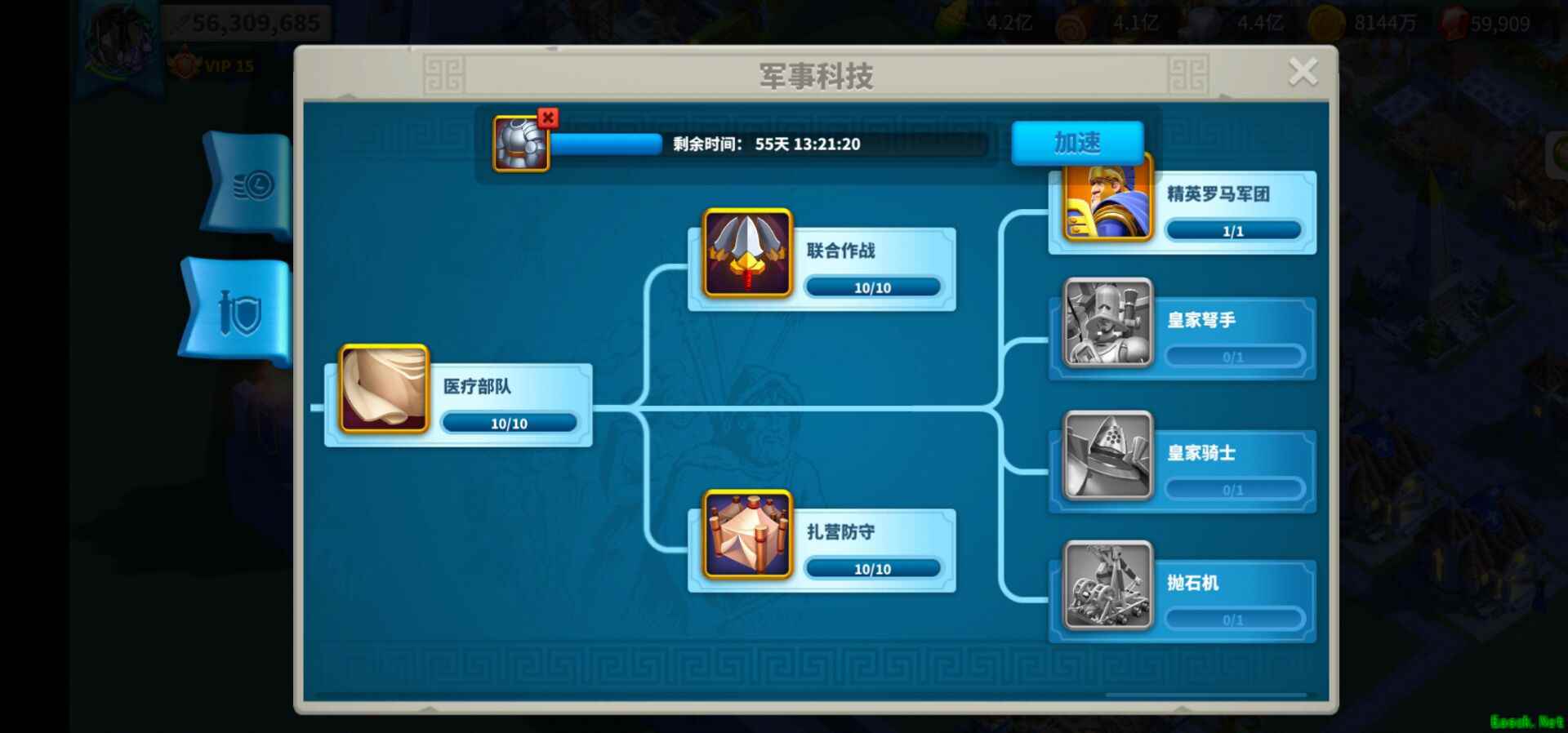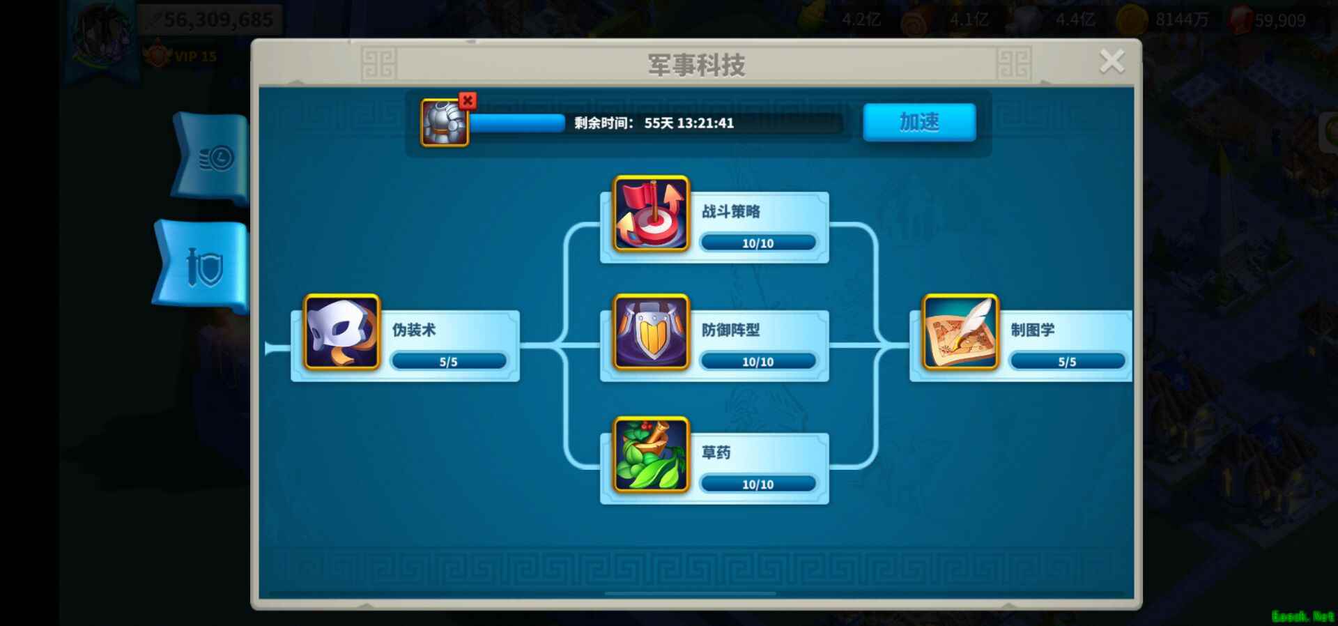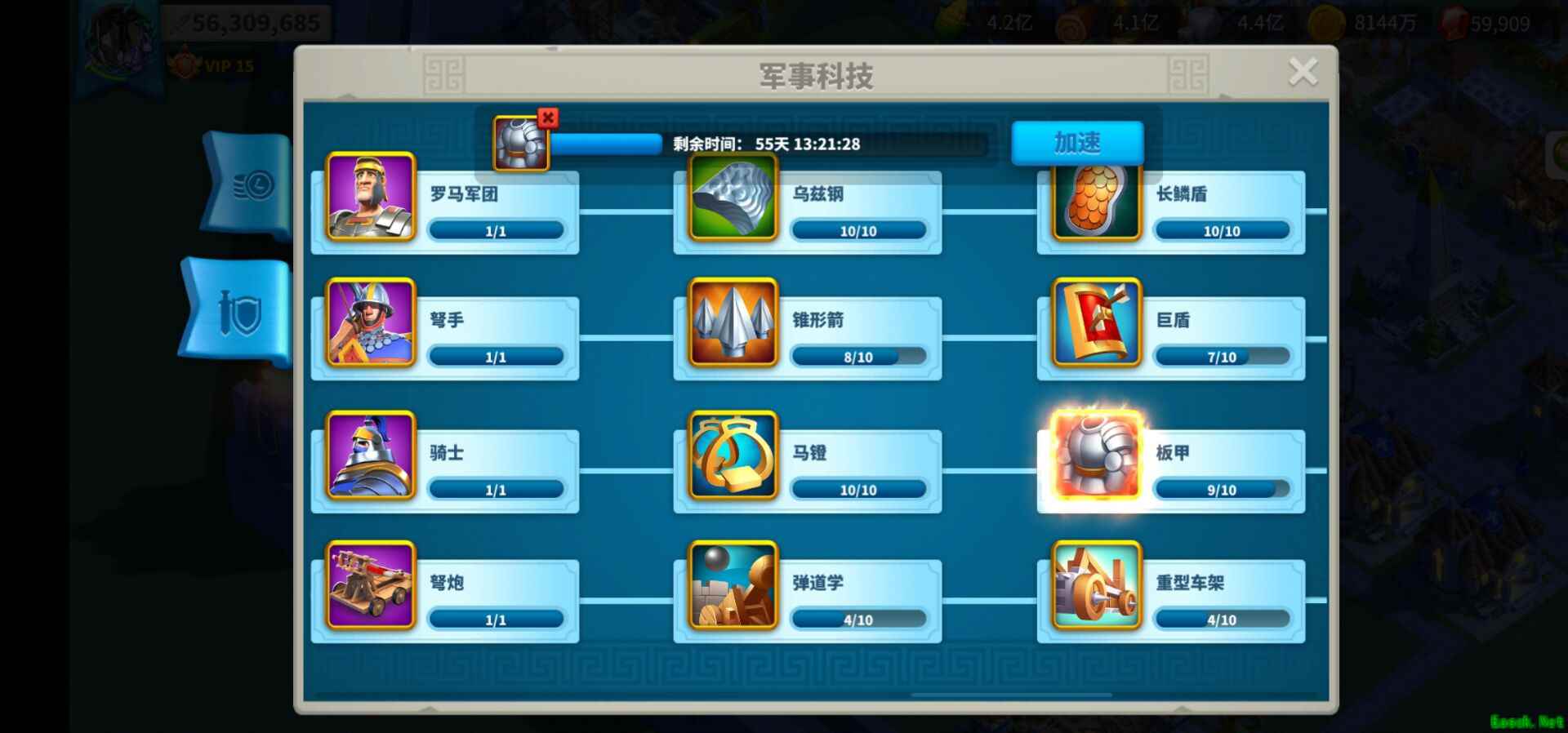 中期科技:这里的科技就是T4兵种研究的前置科技,当然他们不用需要全部研究满就可以研究T4了。但是因为中间三项科技都是十等级,所以需要很长时间,这三项的等级十部分每项拿到符文按满帮助都需要一百天左右,我们称之为小三元,等级十部分的研究一般等到中后期进行。