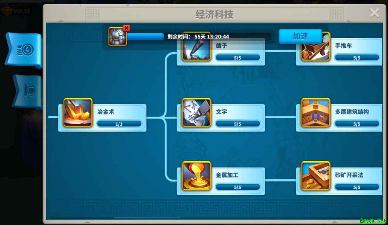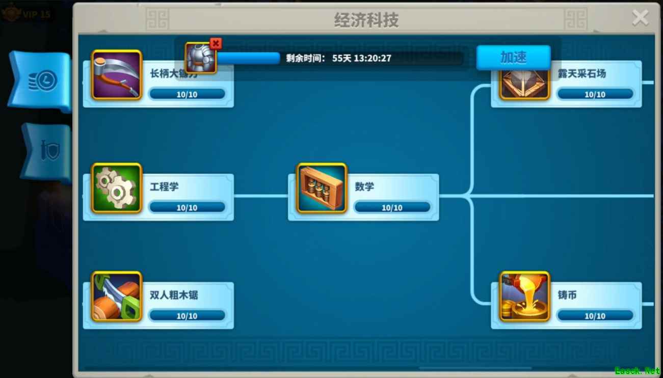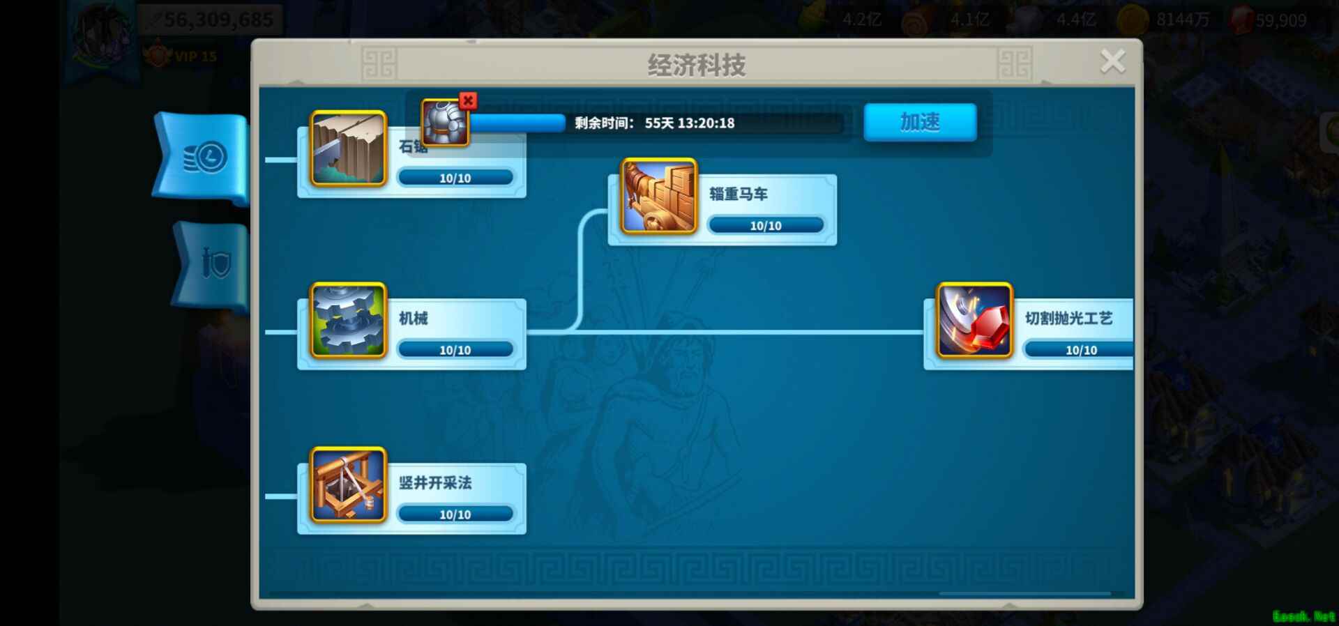 中期科技:这里的科技就是T4兵种研究的前置科技,当然他们不用需要全部研究满就可以研究T4了。但是因为中间三项科技都是十等级,所以需要很长时间,这三项的等级十部分每项拿到符文按满帮助都需要一百天左右,我们称之为小三元,等级十部分的研究一般等到中后期进行。