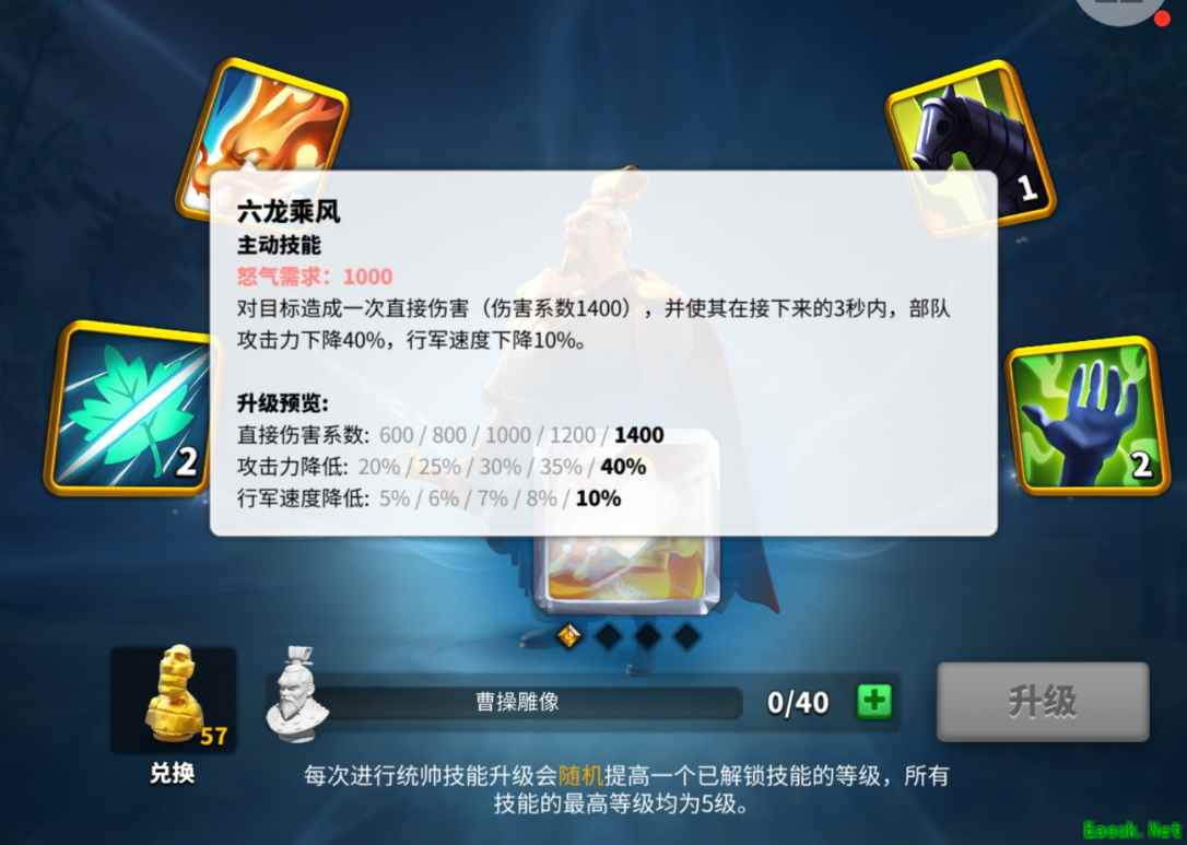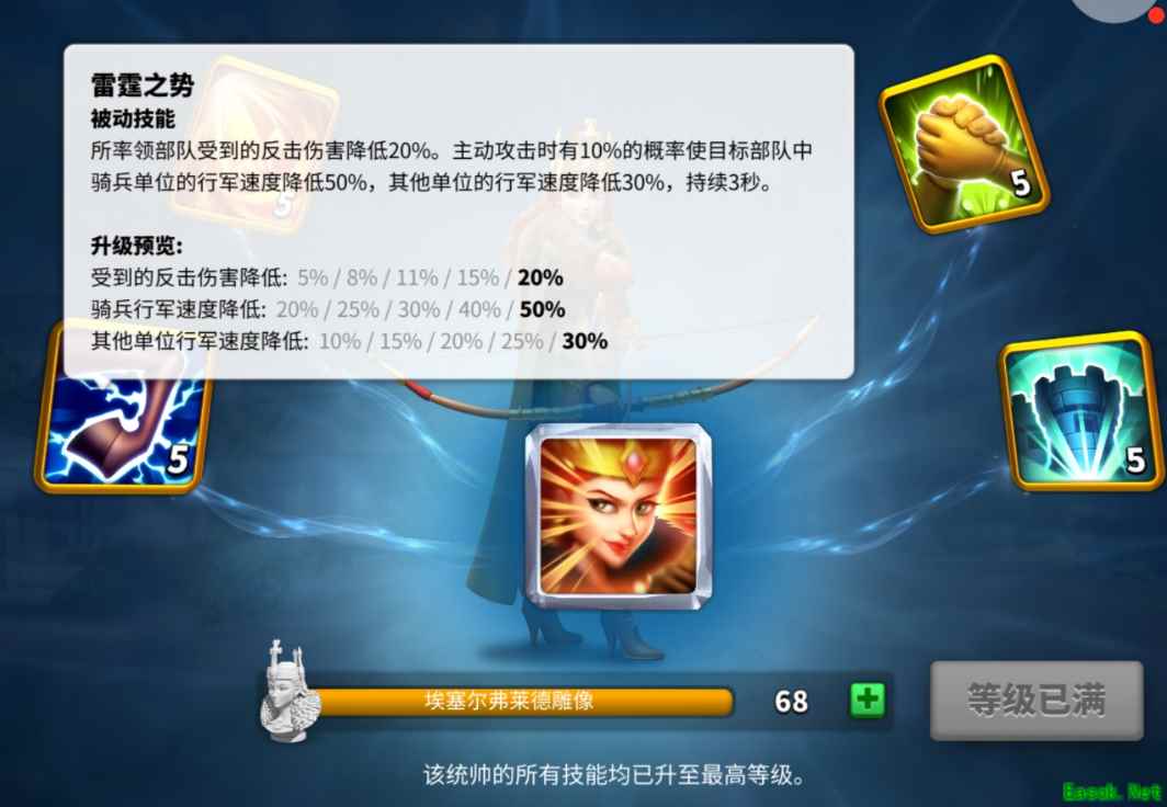 四、诱敌深入 在面对敌强我弱且敌方与我方作战距离跨度较大时,由于骑兵的高机动性。是敌方不二的选择,这时候大量骑兵对我方领土进行攻击时,我们可以采用围剿战术,采用此战术需要一个诱饵进行示弱来诱导敌方高战骑兵进行攻击。 这里推荐紫色骑兵将领进行带兵,在15万左右骑兵即可。我们可以预先在他要经过的旗帜和我方盟友城堡进行驻防。这里推荐有减速技能的将领进行驻防,如曹操,埃塞尔弗莱德。在敌方骑兵超过我方的驻防将快要打到我们的诱饵时进行包抄收网。利用夹击所带来的伤害加成和特殊将领带来的减速加成来生吃敌方单位。