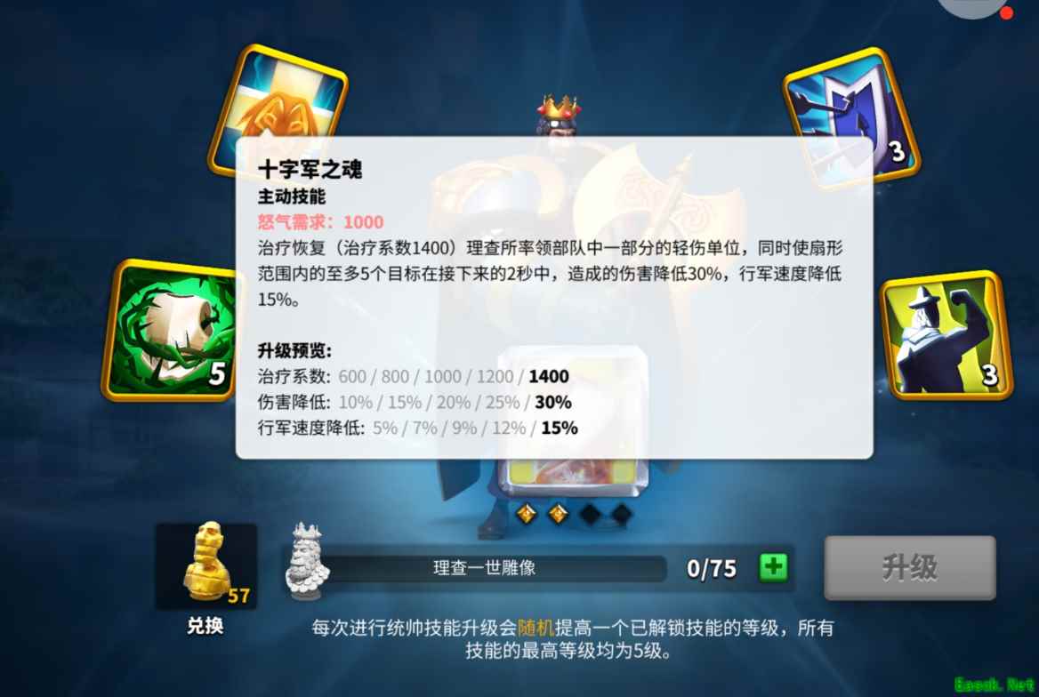 二、游击战 在游戏中难免会出现敌强我弱的情况,如果我方用正规打法无疑会遭受巨大的损失。这时候应用游击战可以很好的消耗敌方战力。 由于敌方兵力的强大,大部分敌人会在远离自己城堡的我方土地作战,这时候我们就可以对他们进行消耗,这里主要有两种方法。 1、利用理查一技能的治疗特点重伤敌人。对靠近我方城堡和旗帜的敌人进行消耗,在敌方大部队进行支援的时候,快速回到城堡或者旗帜。由于理查一技能的治疗系数加成,一般战损比基本为1:2。 2、利用源义经的觉醒技能驻防旗帜和城堡时,会对靠近的敌方单位造成死亡的特性进行消耗,用自身的重伤数换敌方的死亡数。 以上方法由于是应用将领的技能特点进行消耗,所以对谁做主将,谁做副将没有要求。