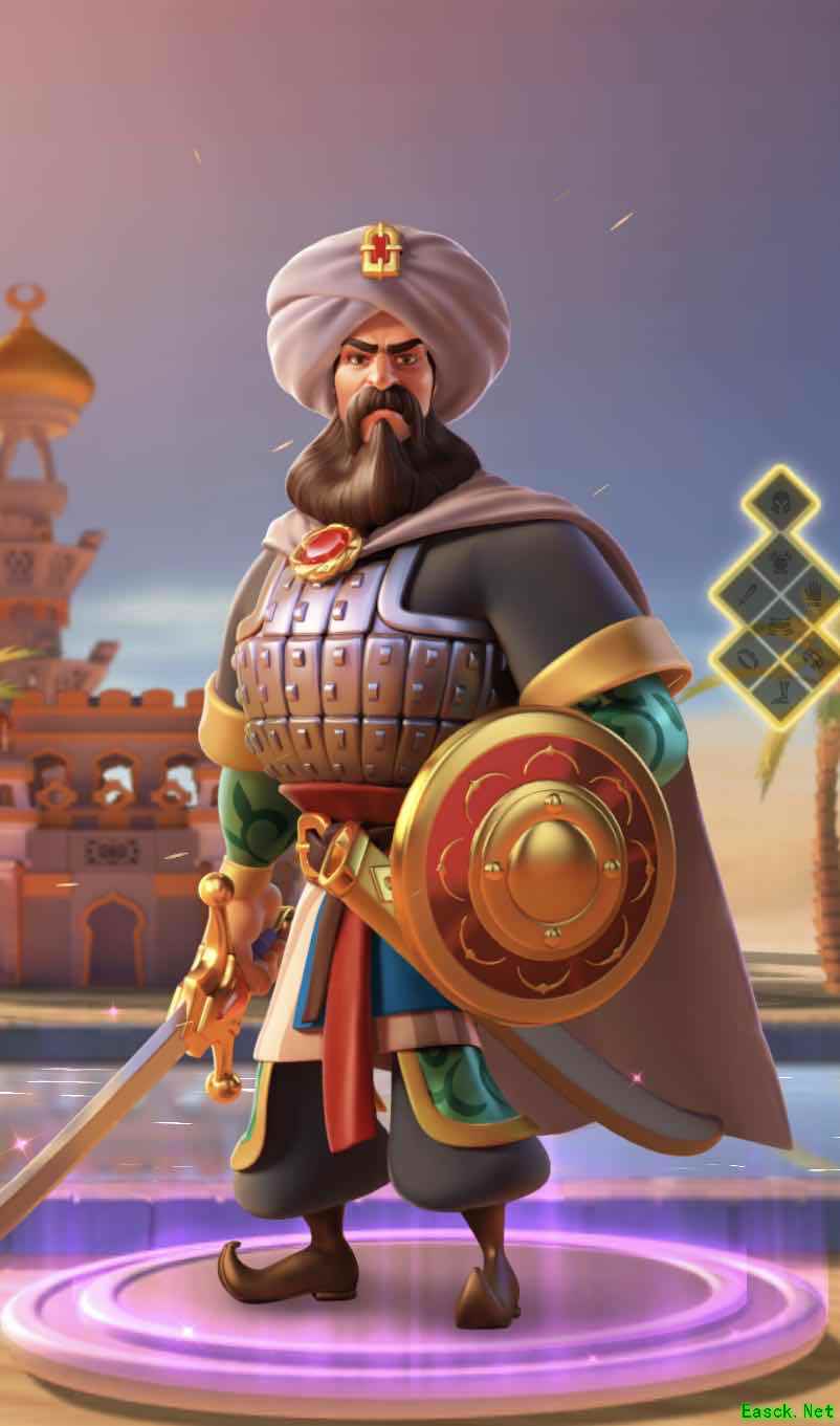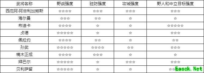 (主)风沙暴(1000怒) - 扇形内最多3个目标,打750伤害系数,并使他们接下来的2秒内,移速-30%。 (被)阿拉伯铁骑 - 骑兵攻击力+20%。 (被)坚壁之困- 攻城时,普攻有100%机率使对方的驻防部队-7%攻和-7%防。 (被)豹王 - 脱战后,治疗200系数轻伤部队,并在接下来10秒+50%行速。 (觉)遮天蔽日(强化风沙暴) - 变为扇形内最多5个目标,打1000伤害系数,并使他们接下来的2秒内,行速-50%。 技能优先升级: 1 > 2 > 3 > 4 (卡1,2) 野战强度:✩✩✩✩✩ 驻防强度:✩ 攻城强度:✩✩✩ 野蛮人和中立目标强度:✩✩✩ 拜巴尔是少数骑兵当中有范围技能的武将,所以不管游击、野战、大型战争,都能看到他的身影。后期,拜巴尔攻城会被其他武将代替,但他本身还是相当不错的武将,打野蛮人方面和孙武楠木正成一样要注意血量。 9、初始将领/贝利撒留