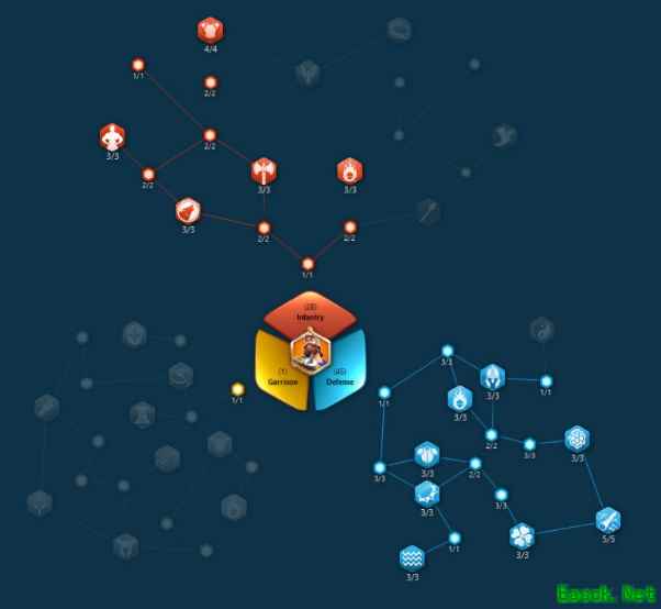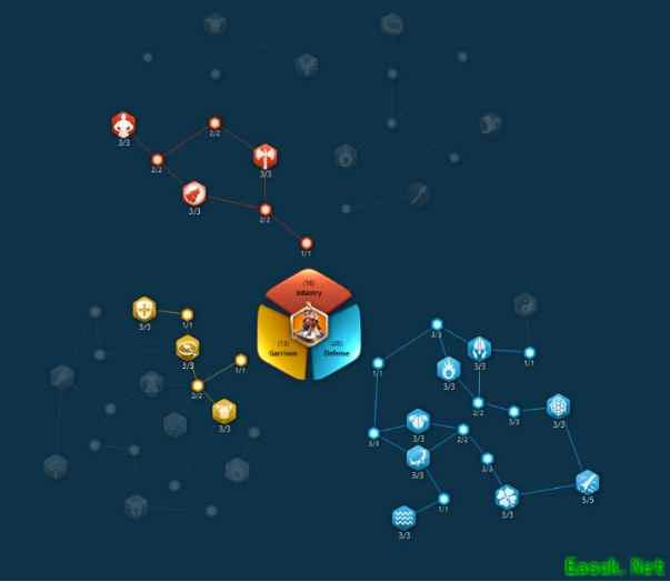 驻防:驻防更多时候并不是用于保护自己的城市,由于城市可以开保护盾获得无敌的效果,在游戏里,驻防更多的是用于守联盟的旗帜和要塞等。因此我们并不需要提高警戒塔的能力,也就不需要选择增加警戒塔属性的天赋。由于驻防时,我们很难控制联盟的成员是否会使用纯兵种驻防,所以步兵天赋反而作用不大,而防御天赋会更加有效的提升查理马特驻防的能力。