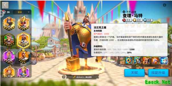 铁锤的反击(被动技能):提升所率领部队30%反击伤害。 由于查理马特的主动技能并不会造成任何的伤害,所以查理马特的主要输出来源于普通攻击的伤害和反击伤害,而这个技能可以提升部队的30%反击伤害,算是在一定程度上弥补了查理马特输出不足的短板。