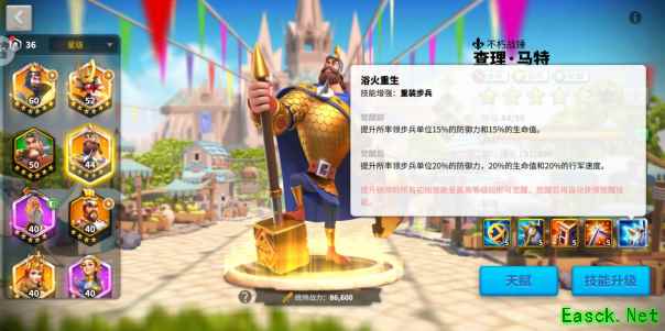 重装步兵(被动技能)(浴火重生(觉醒)):提升所率领步兵单位15%(20%)的防御力和生命值,(提升所率步兵单位20%行军速度) 步兵是一个防御力和攻击力都不俗的兵种,这个技能带来的属性提升数值非常之高,在所有武将的技能当中,查理马特带来得部队属性提升,已经是在第一梯队了。而且由于步兵是个重装兵种,所以有个致命的缺陷就是移速特别的慢,而查理马特增加移速的效果正好弥补了步兵移速慢的问题。