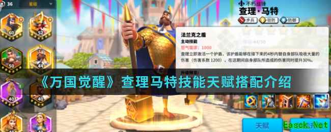 查理马特技能天赋搭配介绍: 一、 技能分析 技能专精顺序推荐:1→2→4→3 法兰克之盾(主动技能):查理立即激活一个护盾,该护盾能够在接下来的4秒内替自身部队吸收大量的伤害(伤害系数1200),在这个期间自身部队所造成的伤害同时提升30%。 从技能描述可以看出,这并不是个强大的输出技能,但却是一个强大的吸收伤害的技能,并且查理马特的输出是普通攻击伤害和反击伤害,提升30%的伤害也非常适合这个属性,查理马特还可以搭配技能输出型的武将(副),当查理马特释放技能后,可以提高副将的技能伤害。