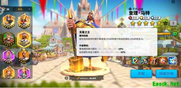 无冕之王(被动技能):担任驻防统帅时提升警戒塔10%的防御力和驻防部队10%的攻击力。 这个技能的存在正是查理马特能在众多一代武将中脱颖而出的原因!在一代武将中,能担任驻防的传说武将少之又少,而查理马特正是其中之一,在第一季kvk中,查理马特可以说是最强大的驻防统帅了。