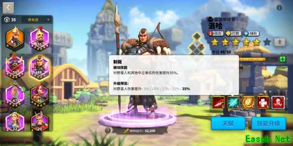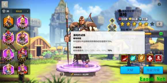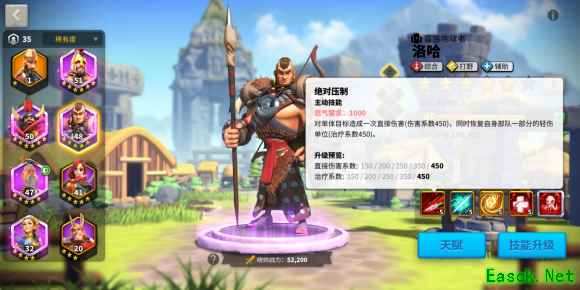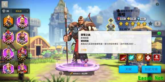 要了解这个技能,我们首先要了解游戏中经验获得的机制!游戏里面,当部队经过野蛮人、守护者,或者一切可以获得经验的单位时,主将和副将所获得的经验是完全相同的。这个技能亮眼之处就在于他的经验值提升70%,这是游戏中目前经验提升最多的一个技能,洛哈也是可以获得经验最多的武将,所以我们可以利用这个特性让洛哈带着其他武将练级。 桀骜之血(被动技能)、(不屈之魂(觉醒)):脱离战斗后,洛哈能够恢复一部分的轻伤单位治疗系数1000(2000)