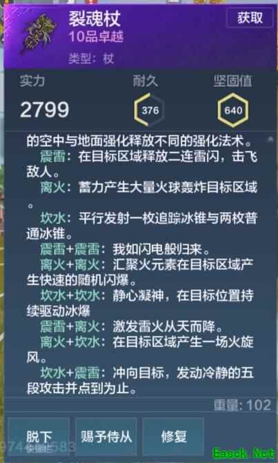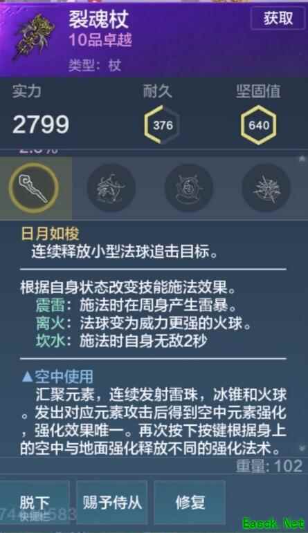 首先法杖描述内是有说明空中使用打出的元素顺序的,这个是触发法杖技能的关键!当你跳起按一下平a时会自动打出3个元素 顺序为:雷 冰(就是水) 火 根据法杖描述可以用不同元素组成技能如下