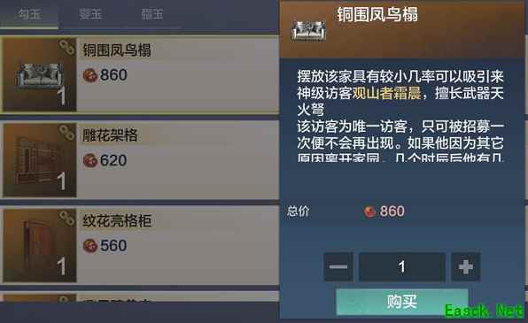 《妄想山海》侍从霜晨招募方法家具:铜围凤鸟塌,商城获得,价格860