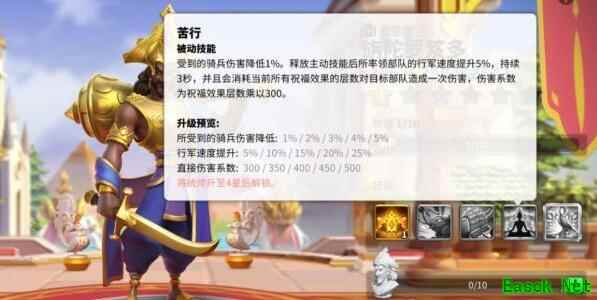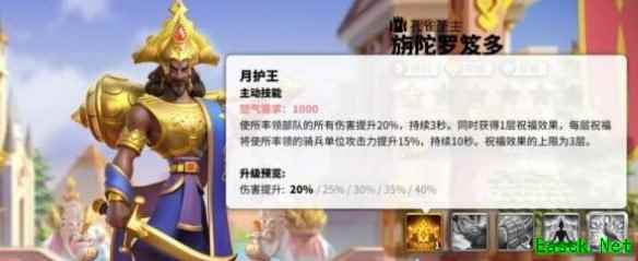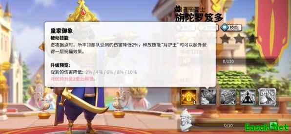 (被)皇家御象:进攻据点时,所率领部队伤害减免+10%,释放大招时额外获得一层祝福。