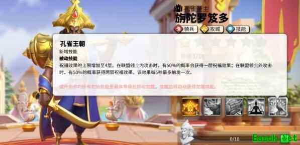 (觉)孔雀王朝:祝福效果上限增加至4层。在联盟领土内攻击时,有50%机率会获得一层祝福;在联盟领土外攻击时,有50%机率会获得两层祝福。每5秒最多触发一次。