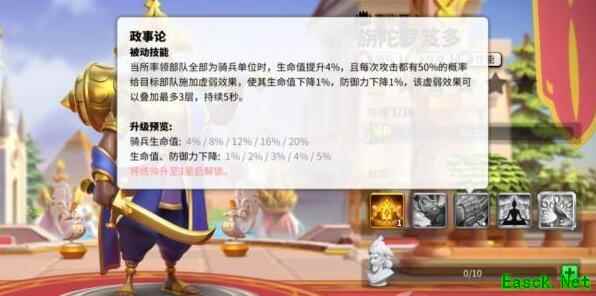 (被)政事论:所率领为全骑时,生命值+20%,每次普攻时有50%机率给目标施加虚弱效果,使其生命值与防御力- 5%,最多可叠加3层,持续5秒。