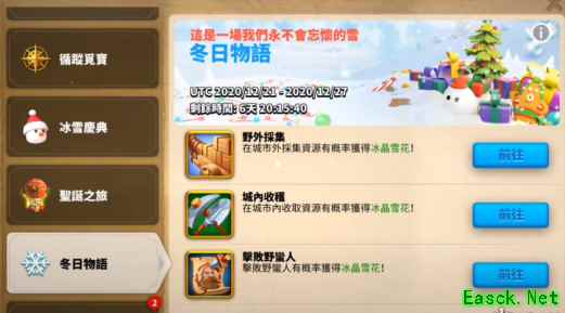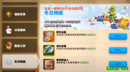 和KVK前置的王国宝箱一样的兑换方式。需要用过商店购买,部队训练,打城寨这三个方式获得圣诞袜,袜子可以开出地图的碎片,集齐碎片可以看到宝藏的位置,然后派斥候获取宝藏。宝藏会通过邮件发送。超过8小时后宝藏消失。(可以与盟友互换碎片) 三、冰雪庆典