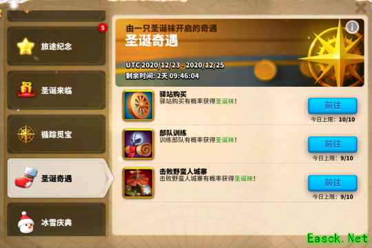 活动期间,所有执政官在击败野蛮人城寨,驿站购买和训练部队时都有一定概率获得圣诞袜,圣诞袜将通过邮件发送。 圣诞袜中含有一些道具,并有概率获得随机一张藏宝图碎片。集齐7张不同的藏宝图碎片可以得到1张完整的藏宝图,以寻得神秘宝藏。 和kvk1阶段的毛皮口袋一样,唯一不同点就是毛皮口袋可以无限刷,但是圣诞袜每天可从任务中获取的数量有限,仅有30个。 三、开始寻宝 当集齐七种碎片以后点击开始寻宝按钮之后会有一个宝藏大概位置的小地图 把地图缩小之后拉到大概的位置寻找即可找到宝藏,点击挖掘即可派遣侍候前往挖掘