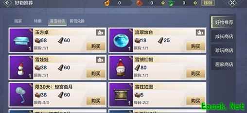 4、家宴结束之后,还可以得到家宴礼包,开礼包几率得到食物、家具、鲜花等游戏道具。 5、同时暮雪商城也上架了一些小玩具,限时兑换哦。