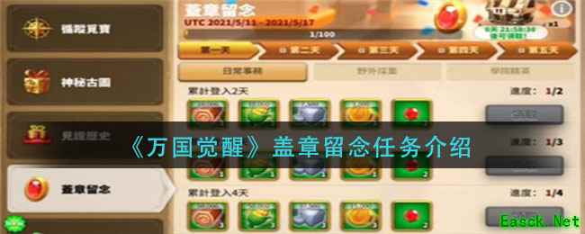 《万国觉醒》盖章留念任务介绍1、第一天:登录游戏、野外探集、科技研究。 2、第二天:行动力消耗、攻击野蛮人、提升战力。 3、第三天:进攻城寨、联盟捐献帮助、提升建筑。 4、第四天:使用加速道具、驿站购买、提升兵力。 5、第五天:守护者符文、收购联盟礼物、收集城内资源。