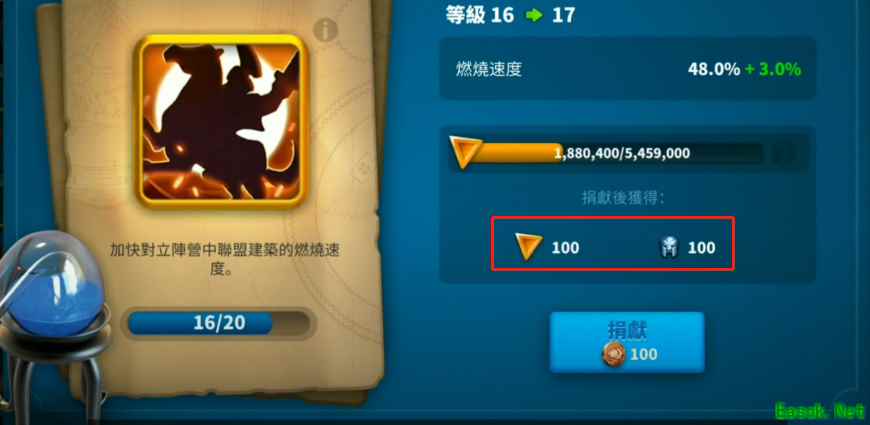 这里的阵营科技是四个王国(光or影)共有的,阵营之力的升级快慢将影响你们战斗的输赢。和联盟科技一样,阵营之力里面有很多增加攻击力,增加防御,增加燃烧速度的科技。提升的越快,在打架时就更占优势。