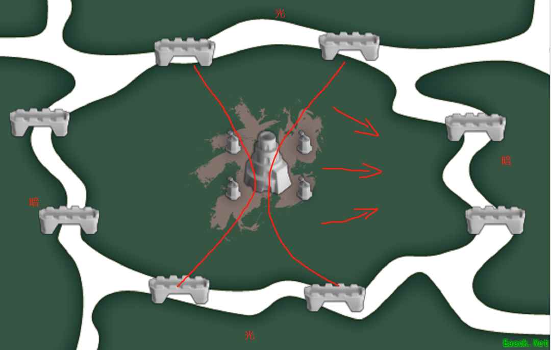 最后就是农民玩家,因为野战需要大量得资源,他们可能不打架,但是他们能农,能否有充足得资源也是持久战胜利得考量。根据国际服得经验,王盟玩家花掉30亿资源算正常水平。 皇庭的重要性 K3的皇庭是无法落堡的。因为上下是光左右是暗,当光占领皇庭后,你插棋子是可以隔断整个地图的。所以地图被断后,你就可以用四国打两国。