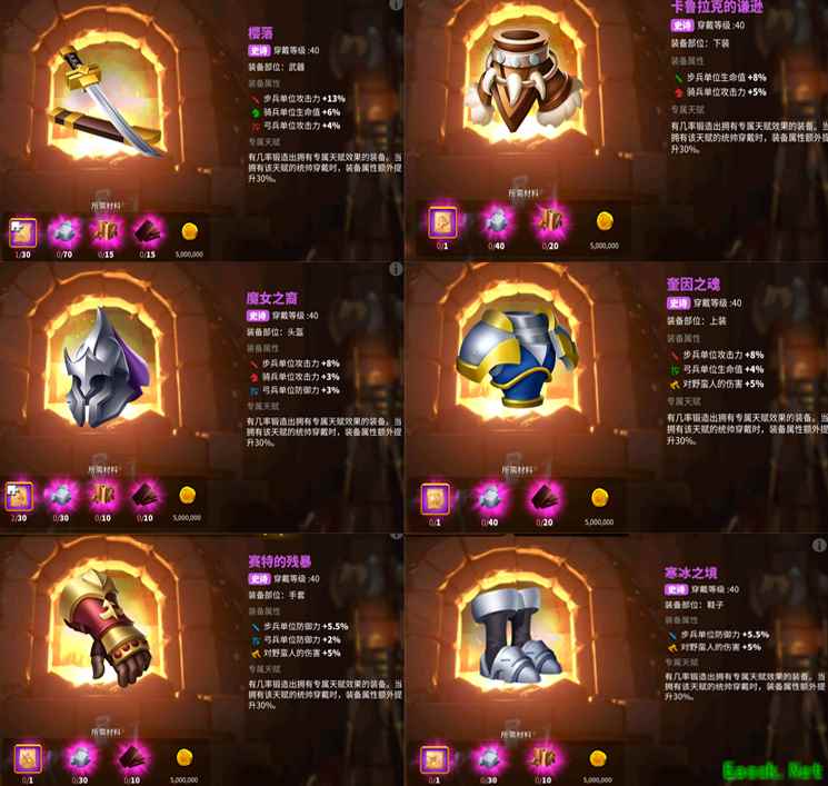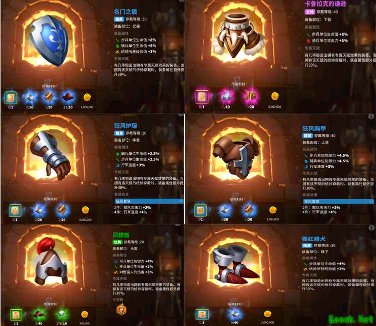 总属性(不计狂风套装加成):步兵防御:+4.5%步兵生命:+24.5%行军速度:+6%野蛮人击杀经验:+6%对野蛮人伤害:+3% 狂风两件套加成属性:部队攻击力:+2%(装备属性增幅以游戏内为准) 所以能得出结论坦度是前期做装备的核心思路之一(活下来,才能配得上刮痧大师称号) 加上容易铸造也是另一个闪光点那这套装备就完美的融合了我们前期的需求加上狂风套的移速加成让我们能在野外横着走逮谁打谁完全不在怕的