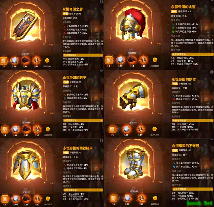总属性(不计永恒帝国套装加成):步兵攻击力:+42%步兵防御力:26% 永恒套装加成属性:部队防御力:+3%行军速度:+10%步兵攻击力:+5%(装备属性增幅以游戏内为准) 神装提供的爆炸三围属性让每一个车头大佬都深深的爱上了它没有最强只有更强只要穿上它让敌军诠释刮痧的含义装备解析与制作优先级示例:虽然小编还没有金装但是梦想总要有的万一呢?在翻阅了大量资料后了解到金装作为RoK里最顶级的装备制作起来非常困难各位执政官是否选择困难症都并发了先做哪个部位都显得尤为重要