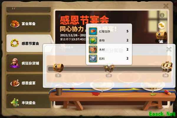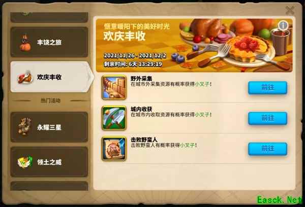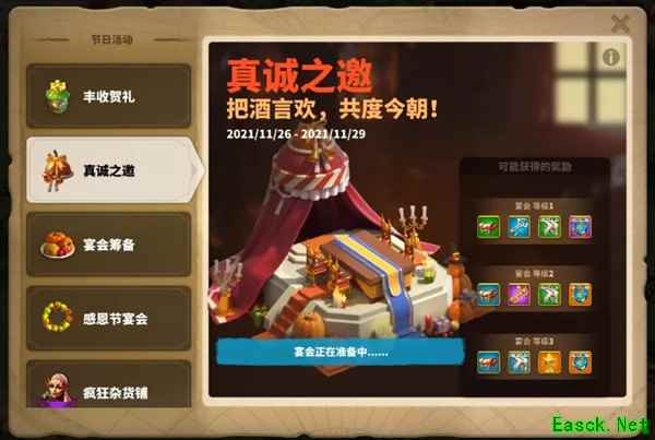 联盟宴会持续12小时,参加宴会需要20分钟的时间。 如果中途离开宴会或宴会结束将无法获得奖励哦(划重点) 当然啦还有经典活动之日常签到任务,只要每天上线动动手指完成指定任务,除了把奖励资源领到手,重点是在要领取本次活动所需的兑换道具“红莓馅饼”和“火鸡腿”。 除了大餐还有大餐!在【感恩盛宴】活动面板里通过交付小叉子获得红梅馅饼,或者消耗宝石获得火鸡腿就会获得相应的宝箱积分。